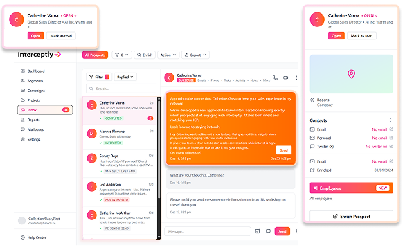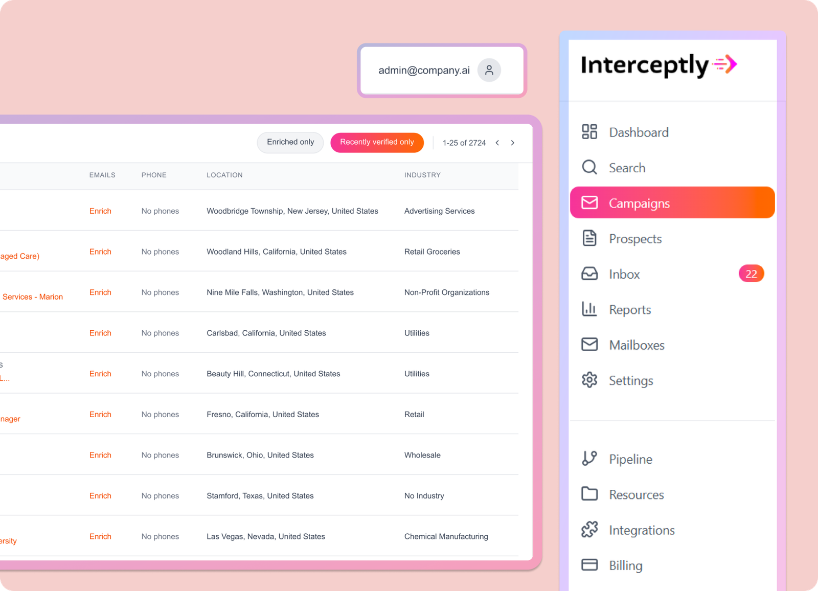 Interceptly supports email, social, and phone outreach, using AI-powered messaging and intent data. Channels can run independently or together, giving you control over how and where outreach happens.