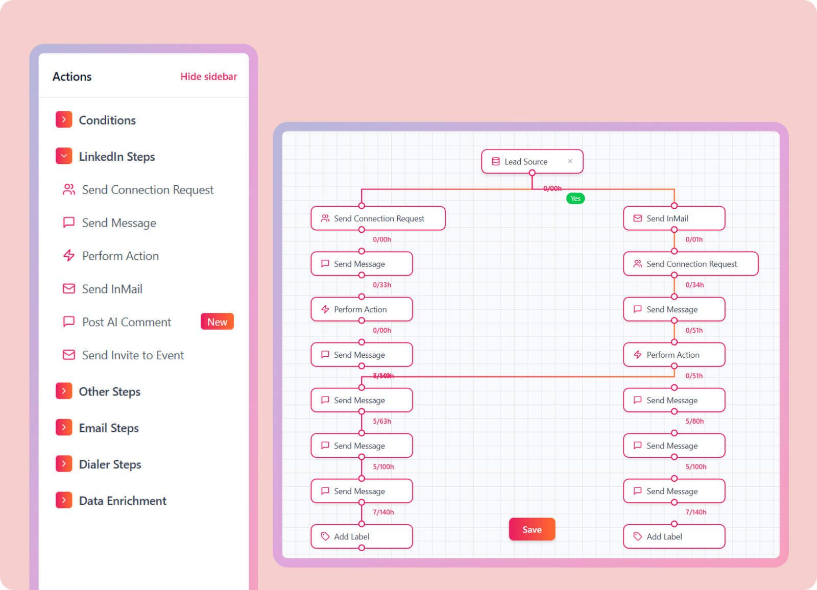 Engage prospects across professional social channels with automated connection requests, follow-ups, and direct messages. Outreach adapts to buyer context and activity, helping you reach prospects beyond your existing network at the right moment. Built-in safeguards manage pacing and behaviour patterns, so campaigns run consistently without risking account restrictions or disruption.