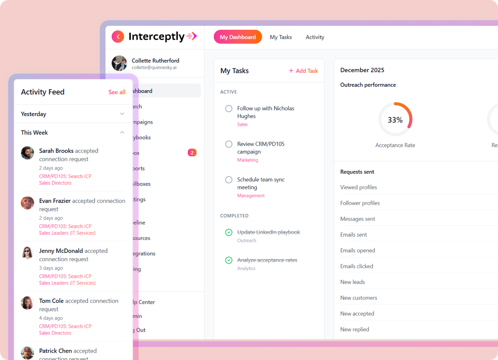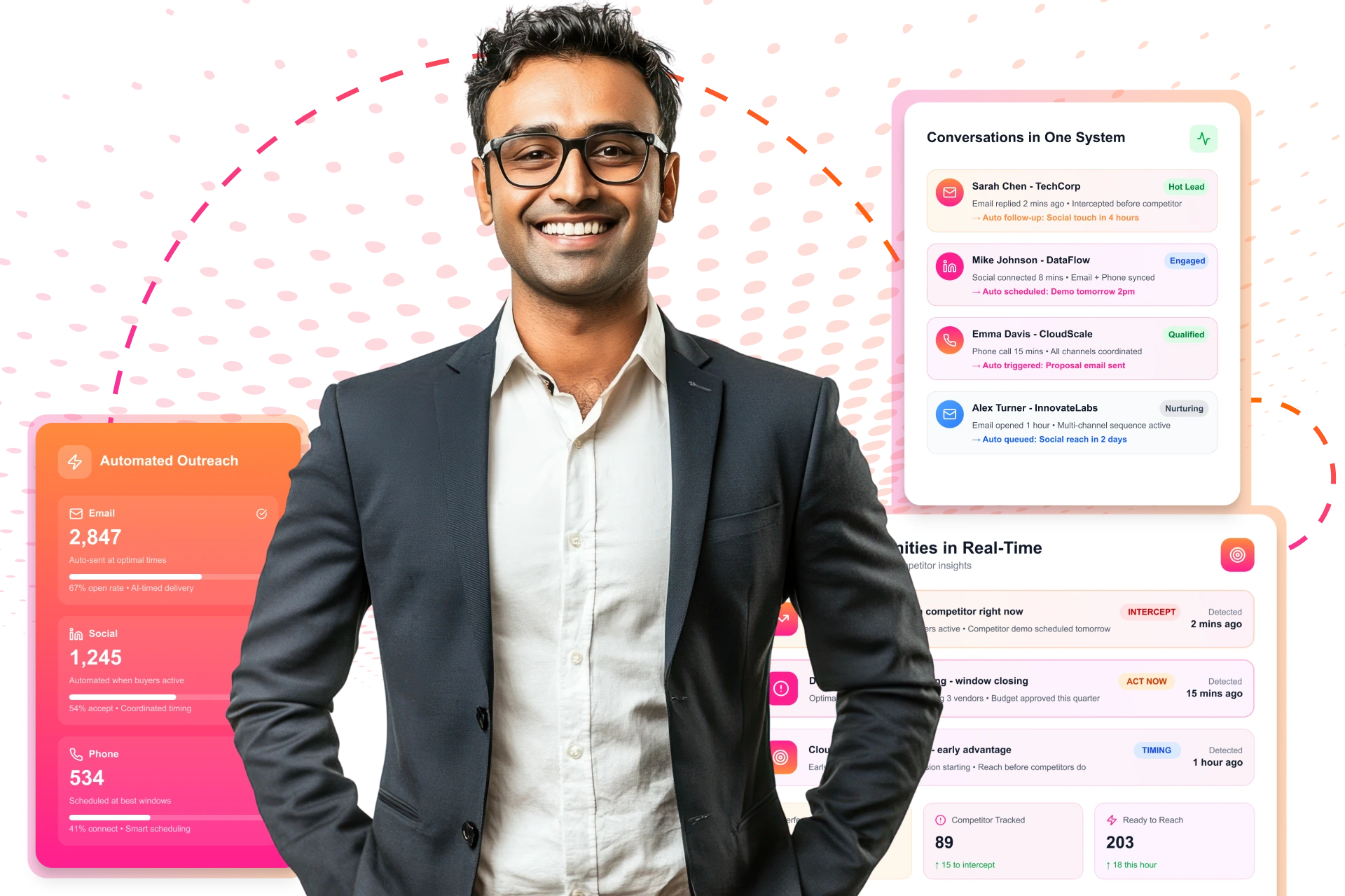 Interceptly coordinates outreach across the channels where buying decisions form, using timing, intent, and automation to engage prospects before opportunities go cold.